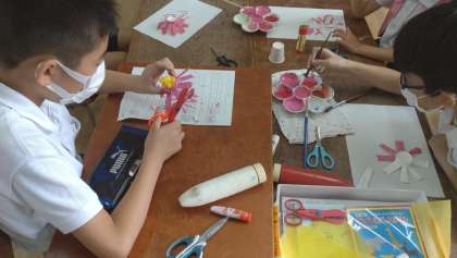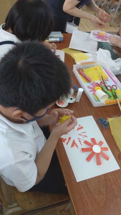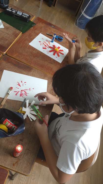 なかよしタイムに紙工作で、コスモスをつくりました。紙コップから、はさみを使って切り取り、絵具で彩色をしてきれいなコスモスの花を咲かせています。。