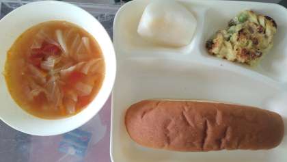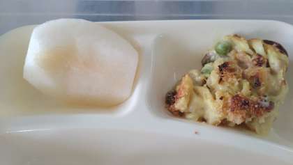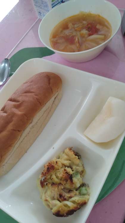 今日の給食は、豆乳マカロニグラタン、トマトスープ、なし(二十世紀)、パン、牛乳です。