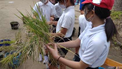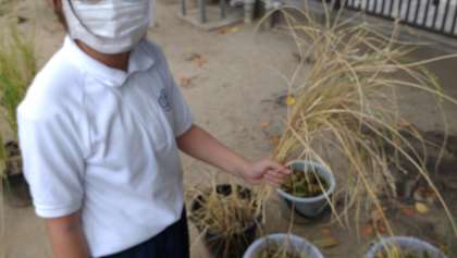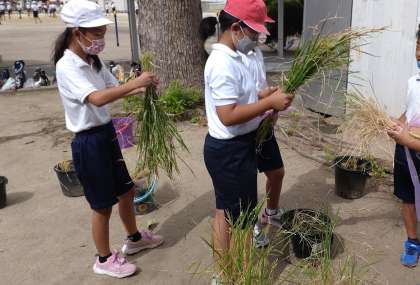 子どもたちは一生懸命に稲刈りに取り組みました。写真は、収穫後に、刈り取った稲を束ねる様子です。