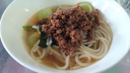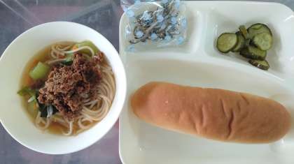 給食のタンタンめんは、チンゲンサイなどの野菜やめんが入った汁めんの上に、味つけした肉みそをのせて食べます。