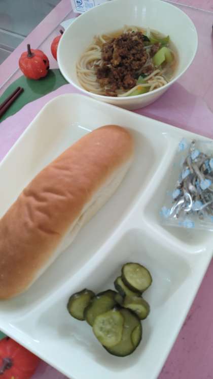 今日の給食は、タンタンめん、きゅうりの甘酢づけ、ミニフィッシュ、パン牛乳です。