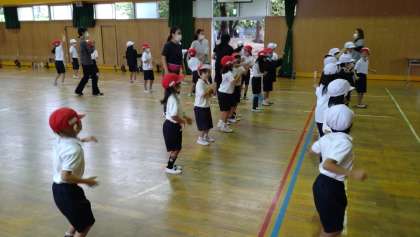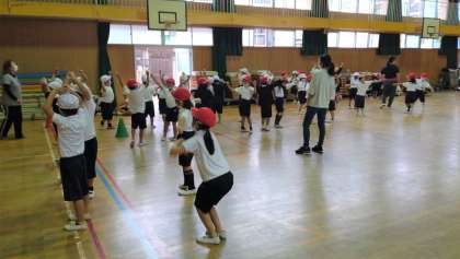 あいにくの雨で、1年生が講堂で運動会の練習に取り組みました。団体演技の練習です。