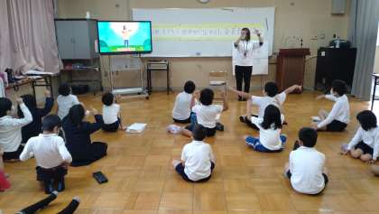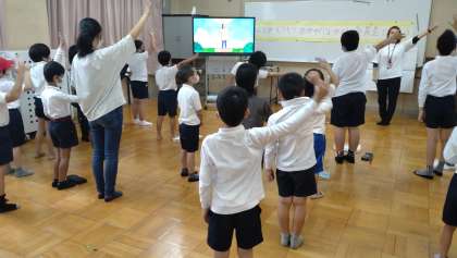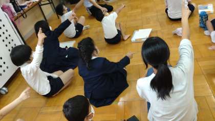 なかよしタイムで、発表会に向けて手話やハンドベル、けん玉の活動をしました。写真は、みんなで歌に合わせて手話をしている様子です。
