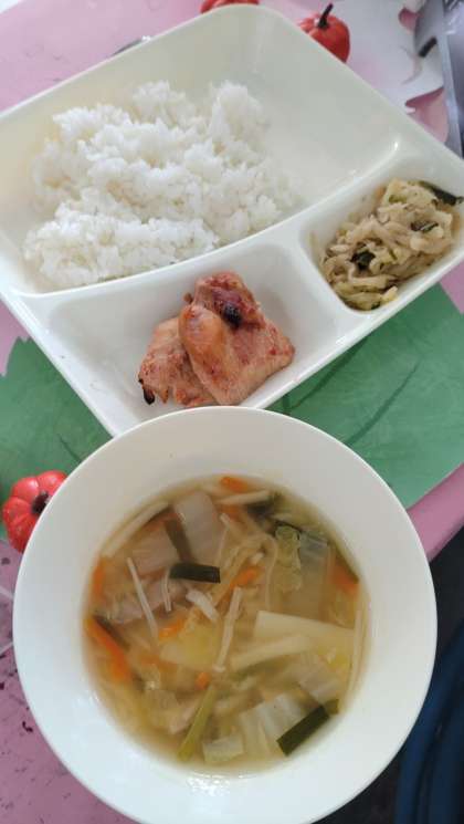 今日の給食は、鶏肉のチリソース焼き、焼き豚とワンタンの皮のスープ、切り干しだいこんのごま辛みづけ、ごはん、牛乳です。