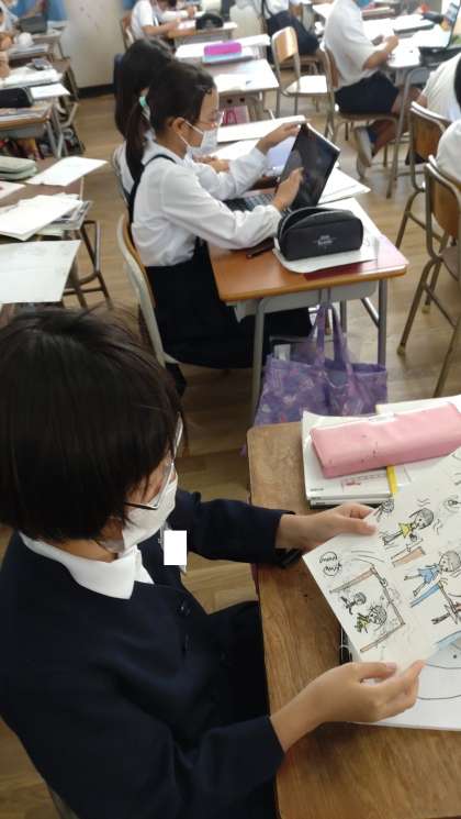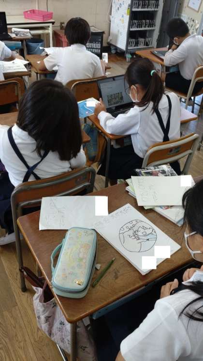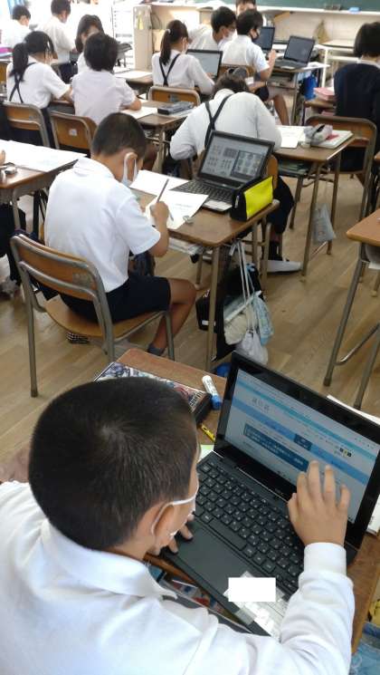 4年生の子どもたちが防災マニュアルづくりに取り組んでいます。一人一台端末を活用して熱心に調べています。