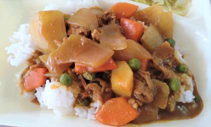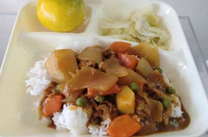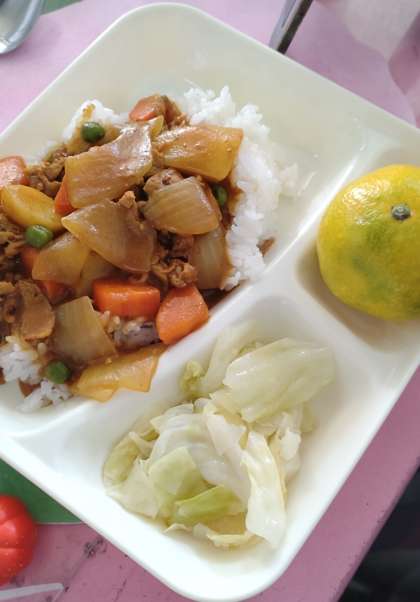 今日の給食は、ポークカレーライス(米粉)、サワーキャベツ、みかん、牛乳です。