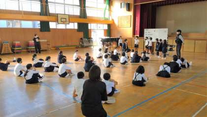 本日、1・2年生対象に出前授業が行われました。不審者対応の防犯教室で、警備会社の方の指導のもと、低学年向けの出前授業でした。子どもたちは、とても熱心に授業を受けていました。写真は、2年生の出前授業の様子です。