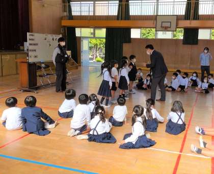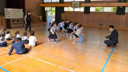 写真は、1年生の出前授業の様子です。不審者から身を守るためのお話を聞いたり不審者に対応するための実践的な練習をしたりしています。