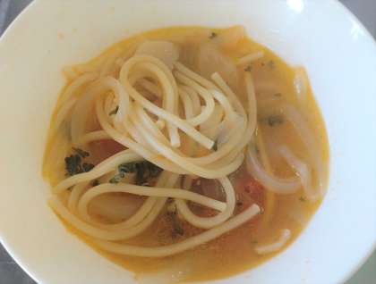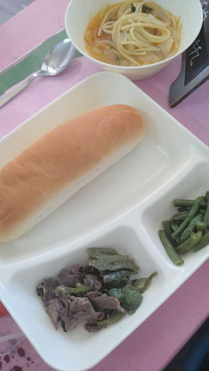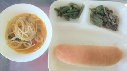 今日の給食は、牛肉の香味焼き、ほたて貝とトマトスープスパゲティ、さんどまめのサラダ、パン、牛乳です。