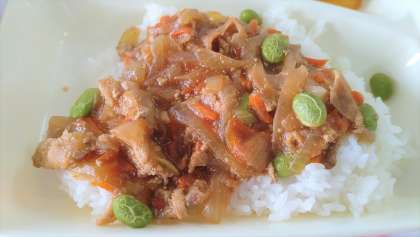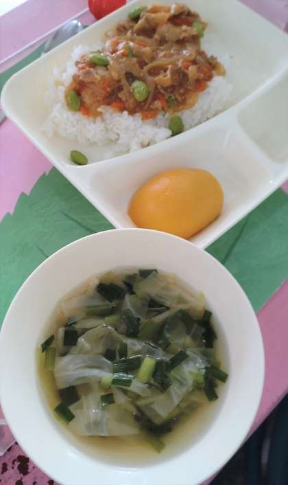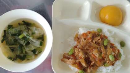 今日の給食は、ピリ辛丼、中華スープ、黄桃(缶)、牛乳です。
