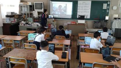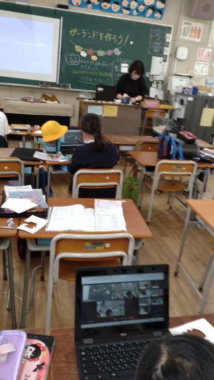 写真は、2年生のオンライン授業の様子です。音楽と図画工作に取り組んでいます。