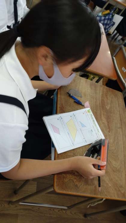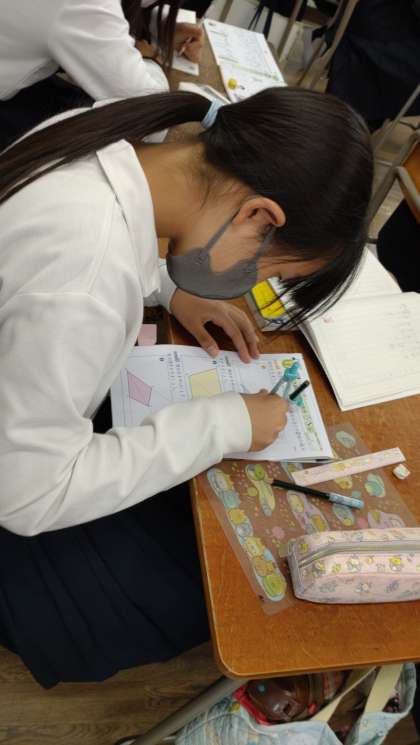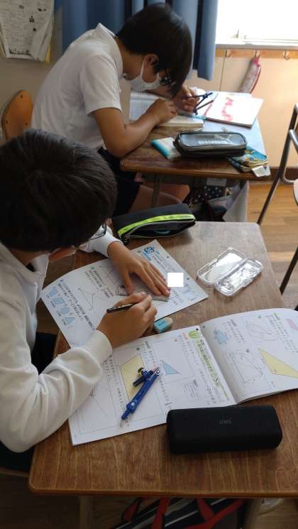 「図形の拡大と縮小」について学習しました。ドリルやプリントを活用して、図形の拡大や縮小の意味を理解し、頂点,辺,角の対応をみつけて拡大図や縮図を作図することができるように学習しています。