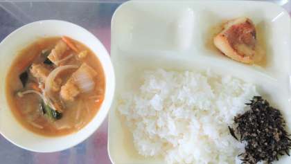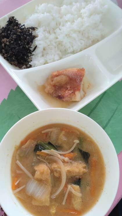 今日の給食は、あかうおのみぞれかけ、みそ汁、牛ひじきそぼろ、ごはん、牛乳です。
