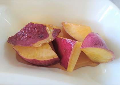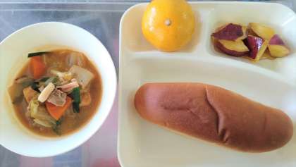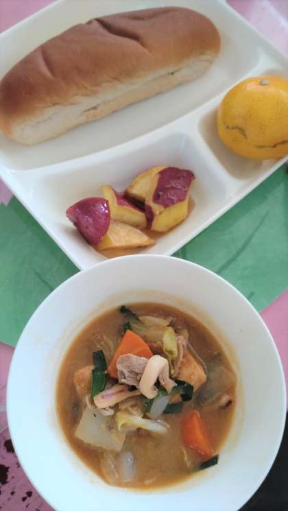 今日の給食は、豚肉といかの中華煮、大学いも、みかん、パン、牛乳です。