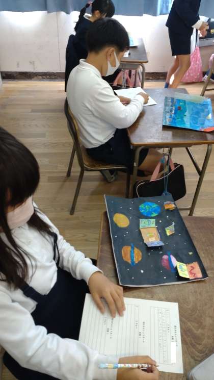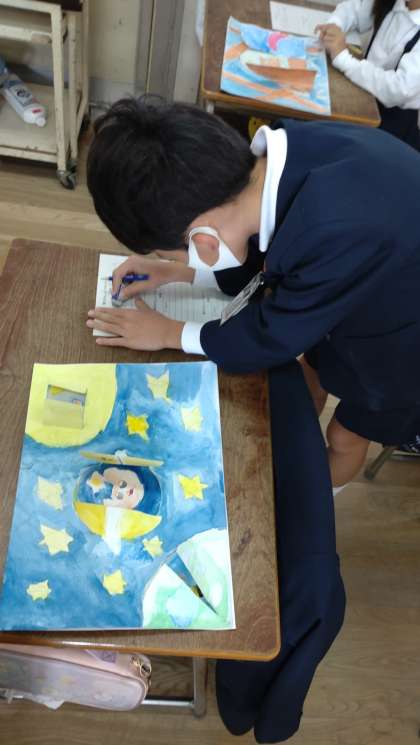 友だちの作品のよいところ見つけて図工鑑賞カードに書いています。構成や発想、彩色など友だちの作品から表現について学んでいます。