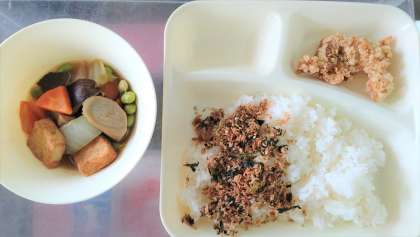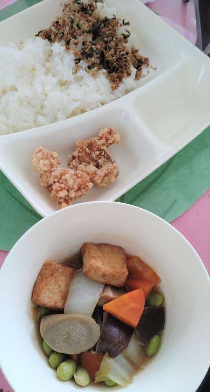 今日の給食は、鶏肉のたつたあげ、あつあげと野菜の煮もの、おかかなっ葉、ごはん、牛乳です。