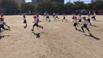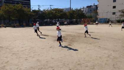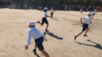 写真は、2年生と4年生がしっぽとりゲームを楽しんでいる様子です。運動場を元気よく走り回っています。