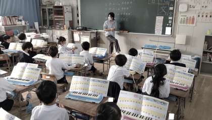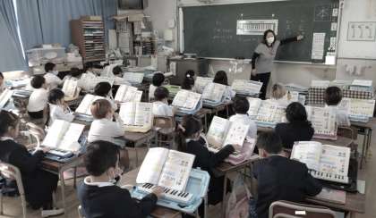 1年生が鍵盤ハーモニカの演奏をしました。ドレミファソなどの基本的な奏法を学んでいます。「もぐりっちょ」の曲で、指使いに気をつけながら演奏を楽しんでいます。