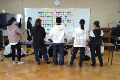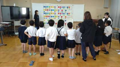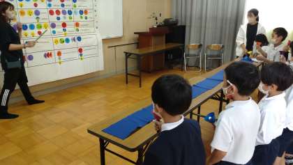 なかよしタイムに、発表会に向けて練習に取り組みました。写真は、先生がお手本を見せて、低学年の子どもたちがハンドベルの練習をしている様子です。友だちと息をあわせて、きれいな音色を奏でています。