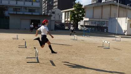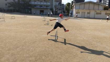 5年生が、陸上運動のハードル走に取り組んでいます。ハードル走は、リズミカルにハードルを走り越えて、記録に挑戦するなど、楽しさを味わうことができる運動です。子どもたちは、熱心に自己記録更新を目指して取り組んでいました。