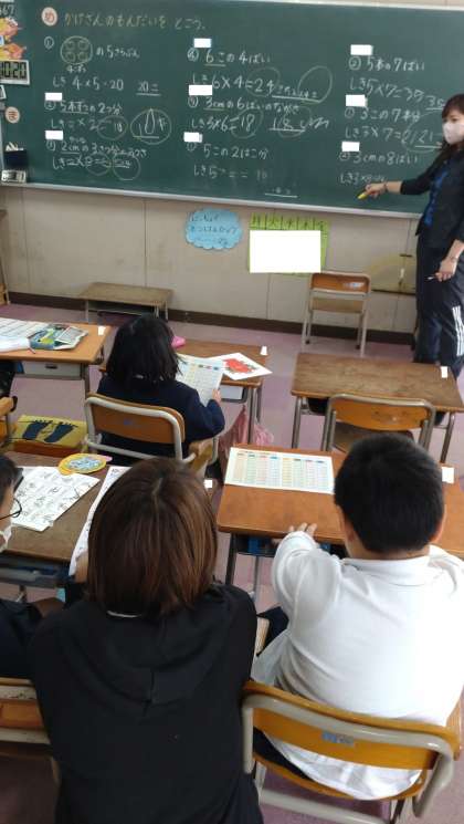 かけ算の学習をしました。これまで学習した九九を使って問題を解いています。