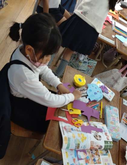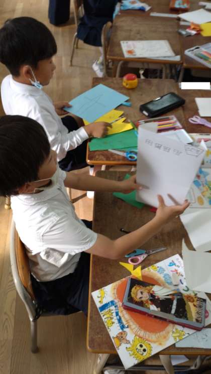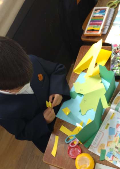 立体作品「おって たてたら」の作品づくりに取り組みました。紙を折って、立てた形から想像をふくらませて、自分の思いついたものを作っています。
