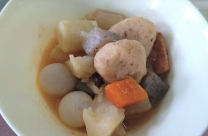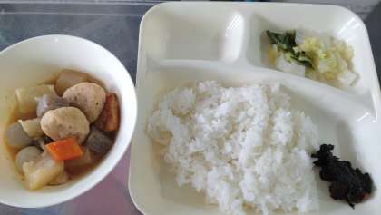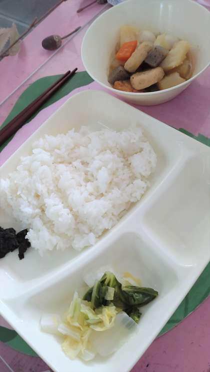 今日の給食は、関東煮、はくさいの甘酢あえ、のりのつくだ煮、ごはん、牛乳です。