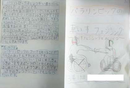 「パラリンピックについて調べよう」の学習をしました。本や資料、一人一台端末PCなどで調べたことをまとめてリーフレットを作成し紹介し合います。下段の写真は、子どもが、「車いすフェンシング」について調べたリーフレットです。