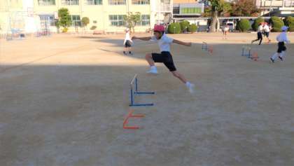 5年生がハードル走に取り組みました。リズミカルなハードリングをめざして、インターバルを選択して、記録の向上をめざしています。グループで、踏み切りを見る人、インターバルを見る人など役割を決めて協力しています。写真は、とても躍動感のあふれるハードリングする子どもたちの様子です。