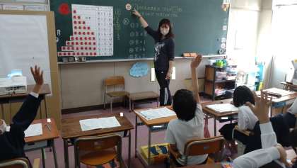 8のだんの九九の学習をしました。たこの絵を見て、一匹に足が8本ついていることから、1匹分から2匹分までのたこの足を考え、答えが8ずつ増えることを確かめました。練習問題も頑張って取り組んでいます。
