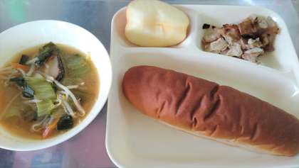 今日の給食は、豚肉のオイスターソース焼き、中華みそのスープ、りんご、パン、牛乳です。