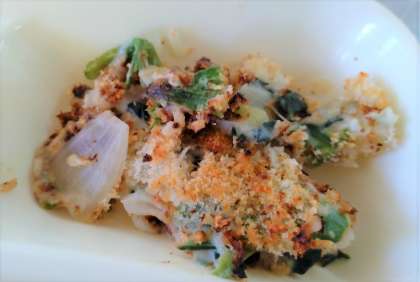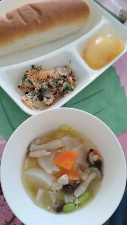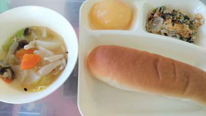 今日の給食は、ほうれんそうのグラタン、スープ煮、白桃(缶)、パン、牛乳です。