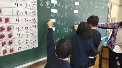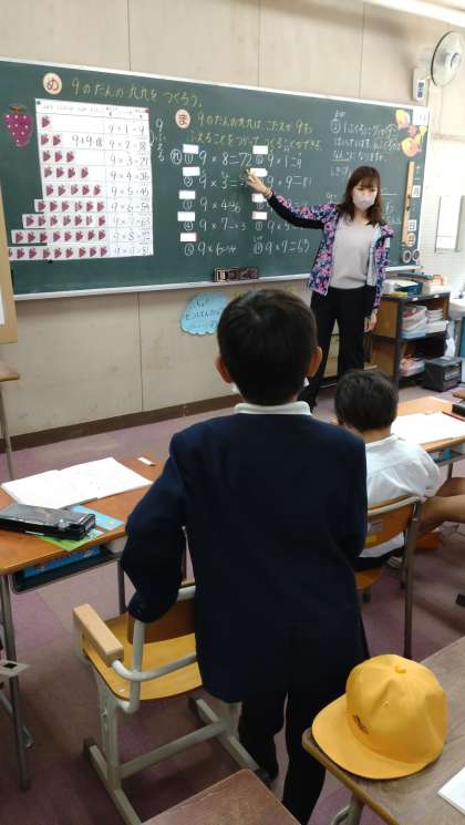 9の段の九九の構成と唱え方を知り、練習をしました。その後、文章問題を解きました。子どもたちの発表も積極的です。