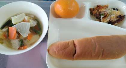 今日の給食は、きのこドリア、鶏肉とじゃがいものスープ煮、みかん、パン、牛乳です。