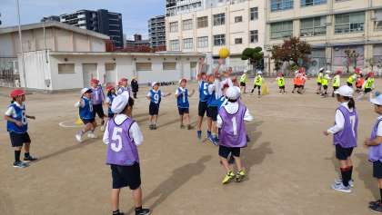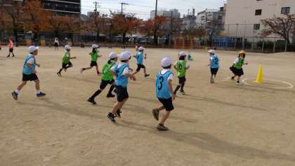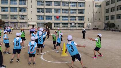 チームに分かれて、コーンシュートゲームをしました。ゲームを楽しみながら投げることに慣れ親しむ運動です。