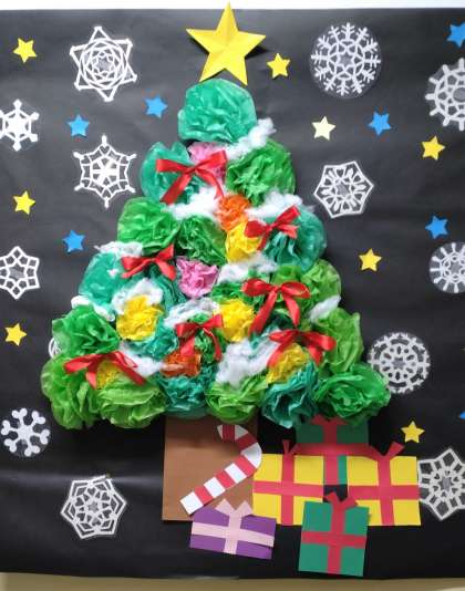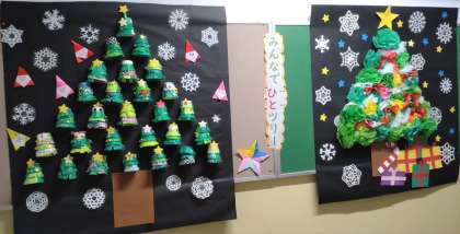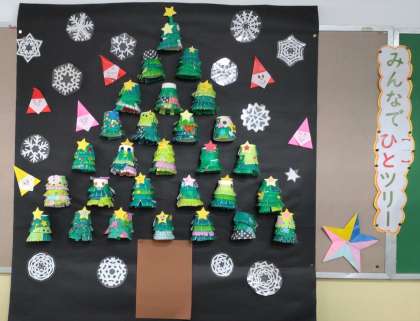 以前制作した紙コップを作ったクリスマスツリーが完成しました。みんなの作品を集めてひとつのツリーをなかよし学級前に展示しています。