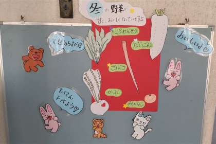 給食調理員さんが、給食室前に掲示をしています。今回のテーマは、『冬の野菜』です。毎回、掲示も工夫されています。