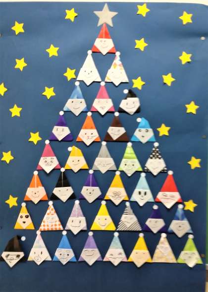 なかよし学級の前の掲示板に、新しい作品が展示されました。たくさんのサンタさんが微笑みかけています。ご来校の際には、ぜひご覧ください。