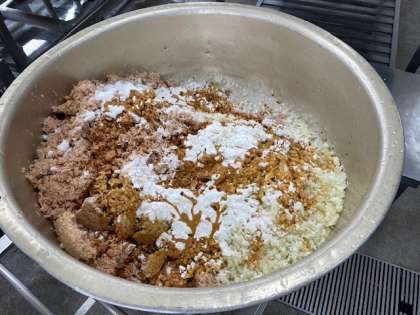 昨日の献立の「とうふハンバーグ」の給食室での調理の様子を紹介します。たまねぎなどを細かく切って、でんぷん、砂糖、塩、こいくちしょうゆを合わせ、練るようによく混ぜ、さらにとうふを加えて混ぜていきます。