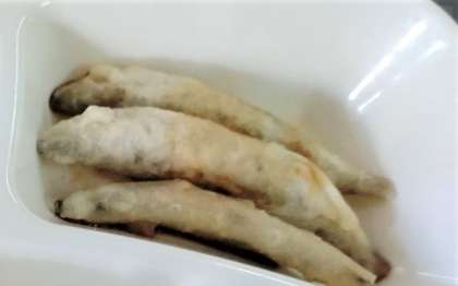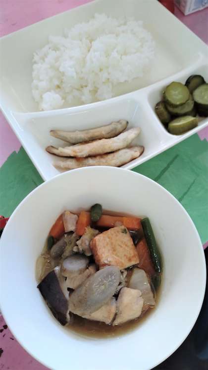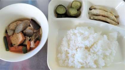 今日の給食は、きびなごのてんぷら、あつあげと野菜の煮もの、きゅうりの甘酢づけ、ごはん、牛乳です。