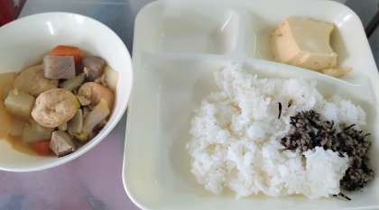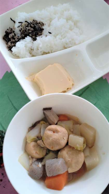 今日の給食は、卵どうふ、一口がんもと野菜の煮もの、魚ひじきそぼろ、ごはん、牛乳です。