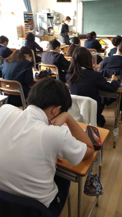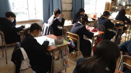 これまで学習してきた歌唱教材や鑑賞教材を振り返って、学習のたしかめをしています。写真は、CDから流れる音楽の課題を真剣に聴いている子どもたちの様子です。