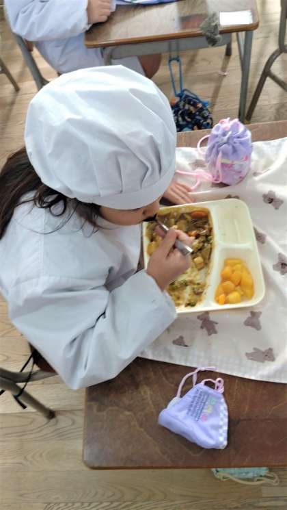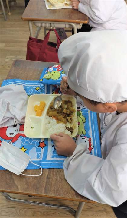 1年生の給食の時間の様子です。おかわりする子もいて、カレーライスを美味しくいただいています。