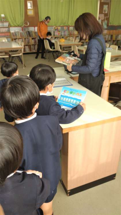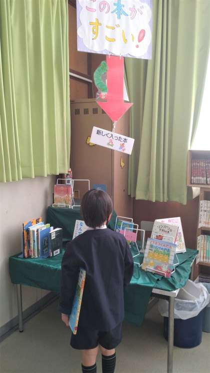 今日は、学校司書の方が来校する日でした。普段、本の読み聞かせ、図書の貸し出しや書籍の整理、おすすめ本のディスプレーの設置など、図書の充実のために業務しています。1年生の子どもたちも、自分のお気に入りの本を見つけて、借りています。写真は、1年生の本の貸し出しの様子と工夫されたディスプレーの本をじっと見つめる子どもの様子です。