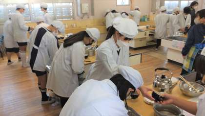 6年生は家庭科の学習で、ゆで卵づくりとお茶を入れました。ゆでる学習で、卵をあつかう実習です。写真は、グループで協力して、鍋や湯のみ茶碗などを丁寧に洗ったり、調理器具を準備したりしているの様子です。