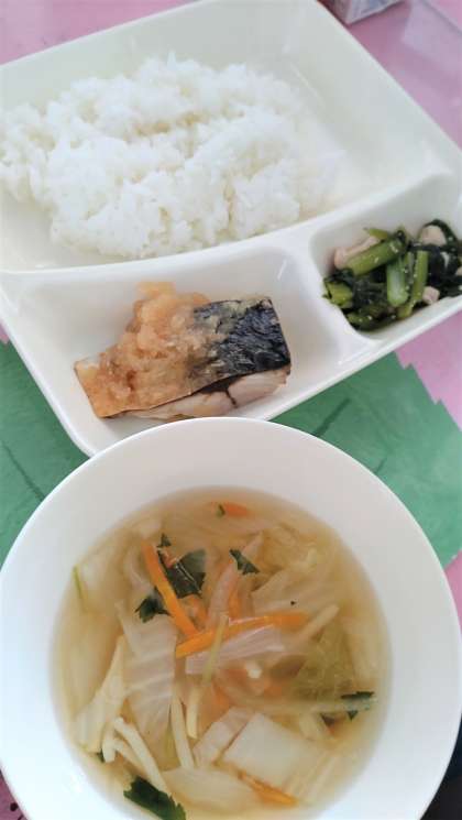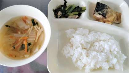 今日の給食は、さばのみぞれかけ、すまし汁、こまつなの煮びたし、ごはん、牛乳です。