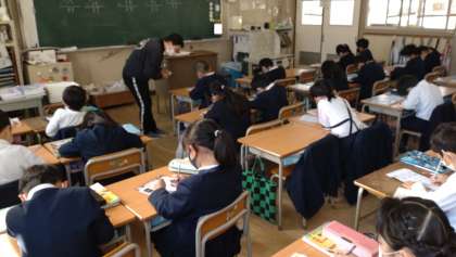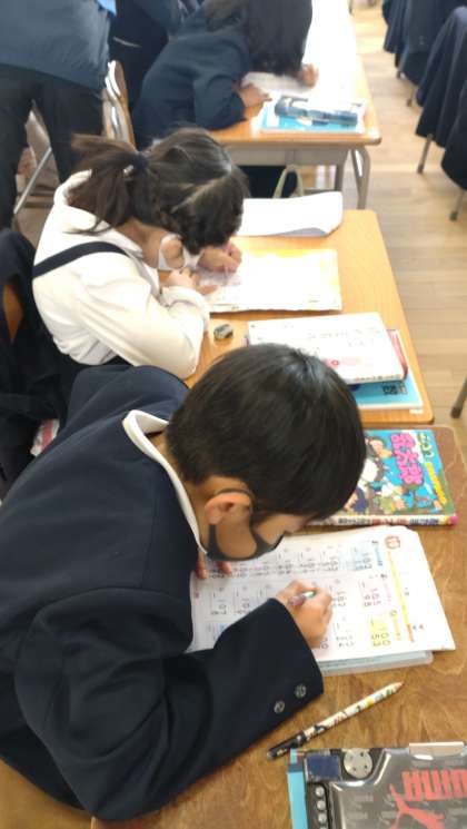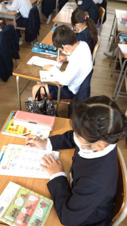 学習の振り返りで、繰り下がりのあるひき算の練習問題をしています。繰り下がりに気をつけて、正しく筆算で計算ができるように取り組んでいます。