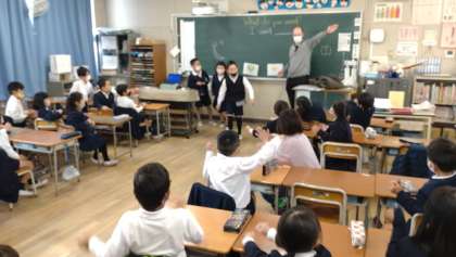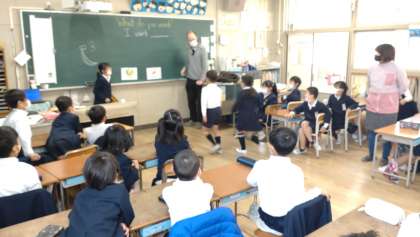 いよいよゲームがはじまりました。基本表現の What do you want ? I want- を使って、野菜や果物の絵カードをはやく見つけるゲームです。2チーム対抗なので、子どもたちは大いに盛り上がっていました。