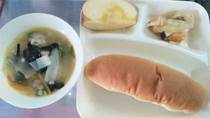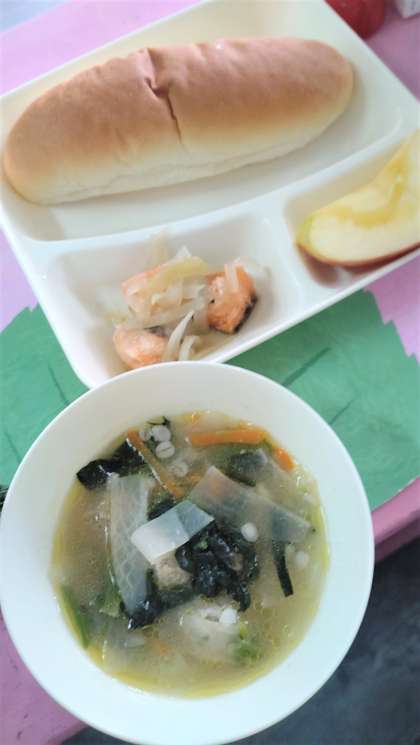 今日の給食は、さけのマリネ、肉だんごと麦のスープ、りんご、パン、牛乳です。