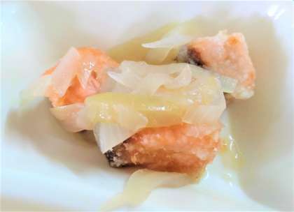 今日の給食では、油であげたさけにマリネ液をからませた「さけのマリネ」が登場します。